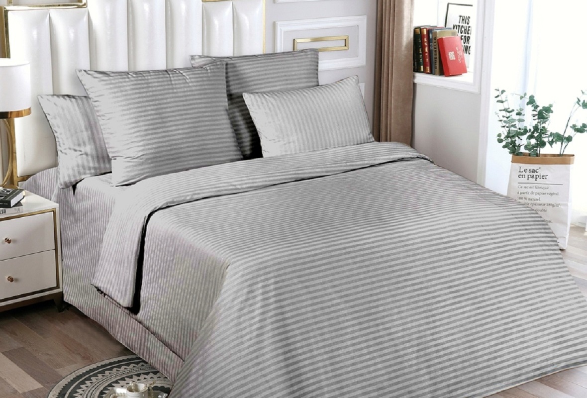 Комплект выполнен из ткани поплин плотностью 110-115 г/кв.м, 100% хлопок, благодаря рисунку полоса, комплект прекрасно подойдет под любой интерьер